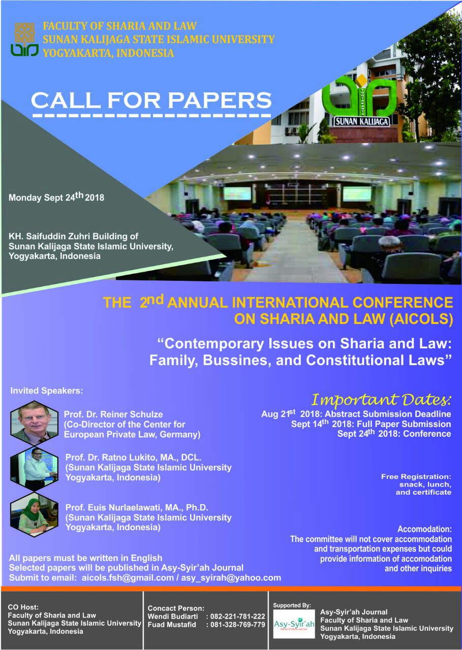 Call For Papers The 2nd Annual International Conference On Sharia And Law(AICOLS) Thursday, 16 Aug 2018 08:48:01 WIB Viewed : 10968 times Download
