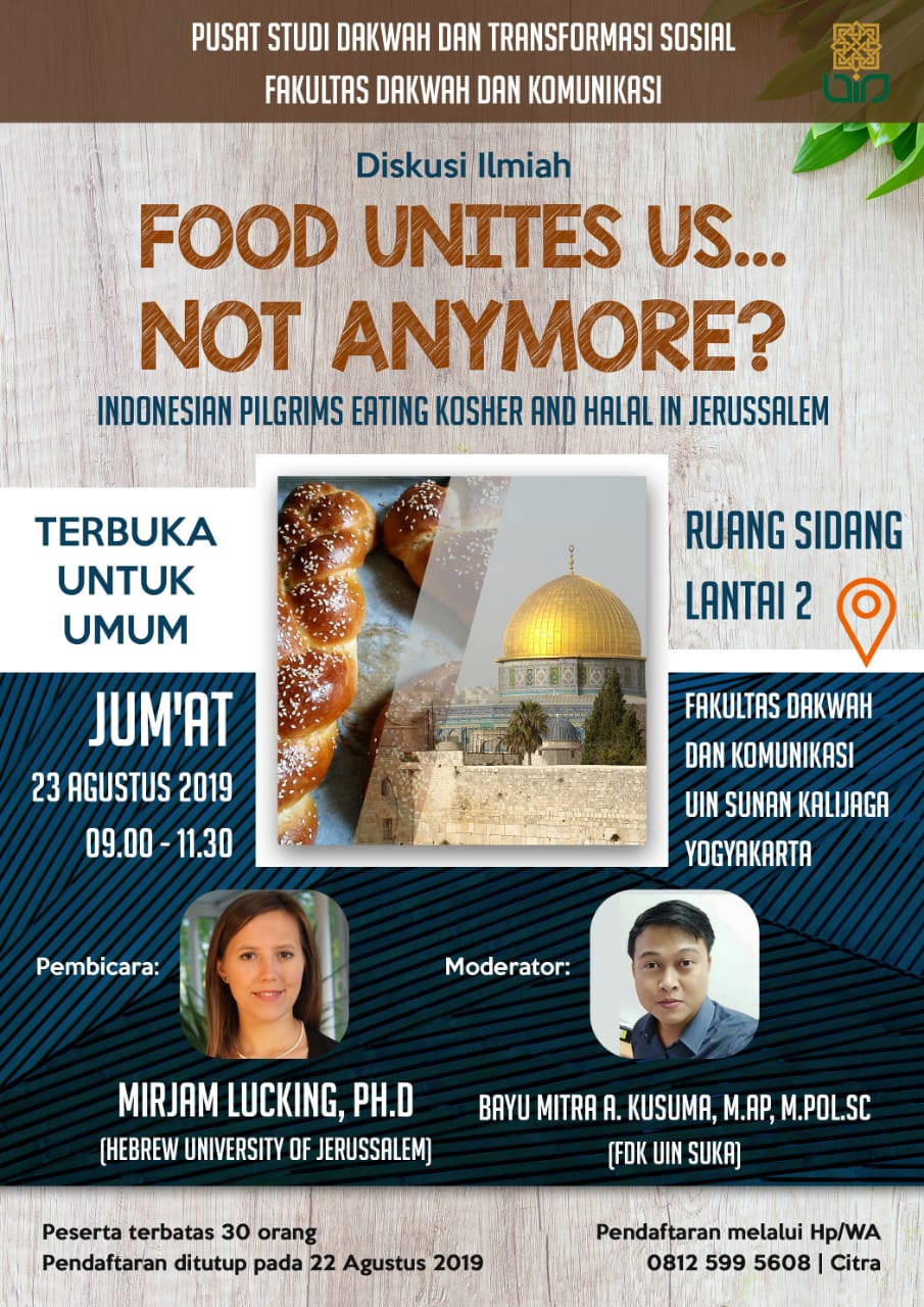 Diskusi Ilmiah "Food Unites Us.. Not Anymore? Indonesian Pilgrims Eating Kosher and Halal in Jerussalem" Thursday, 22 Aug 2019 12:40:19 WIB Viewed : 9544 times Download
