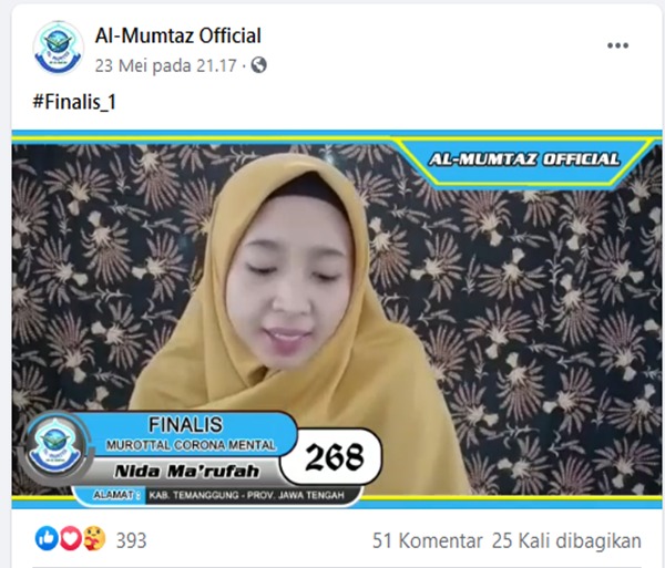 Mahasiswi Magister Komunikasi dan Penyiaran Islam UIN Sunan Kalijaga, Nida Ma’rufah, berhasil menjadi juara ketiga dalam ajang Musabaqah Tilawatil Qur’an Virtual bertajuk “Murottal Corona Mental,” pada 01-23/5/2020. Musabaqah ini diselenggarakan oleh Pondok Pesantren Tahfizhul Qur’an (PPTQ) Al-Mumtaz, Kabupaten Serang, Banten kepada masyarakat umum tanpa batasan usia, dalam rangka menyem ....