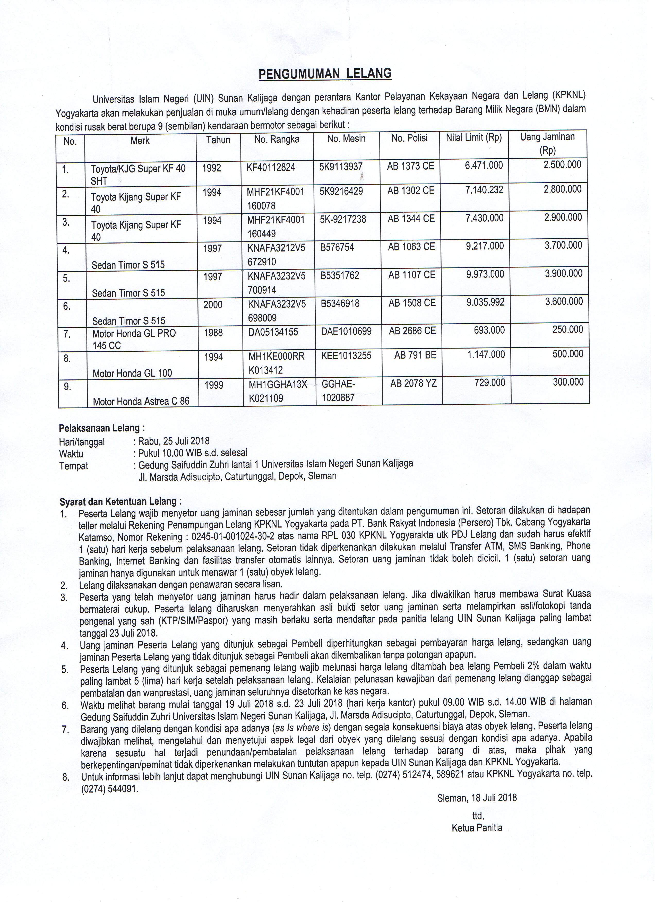 Pengumuman Lelang Paket Peralatan Dan Mesin UIN Sunan Kalijaga