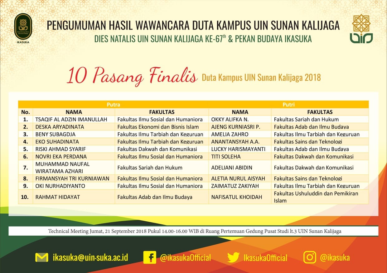 Pengumuman Finaslis Duta Kampus UIN Sunan Kalijaga 2018 Jumat, 21 September 2018 07:49:14 WIB Dilihat : 2688 Kali Unduh