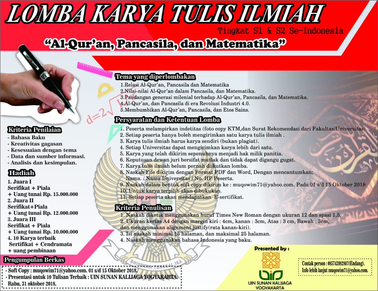 Lomba Karya Tulis Ilmiah "Al-Qur'an, Pancasila, dan Matematika" Senin, 1 Oktober 2018 15:21:14 WIB Dilihat : 4451 Kali Unduh