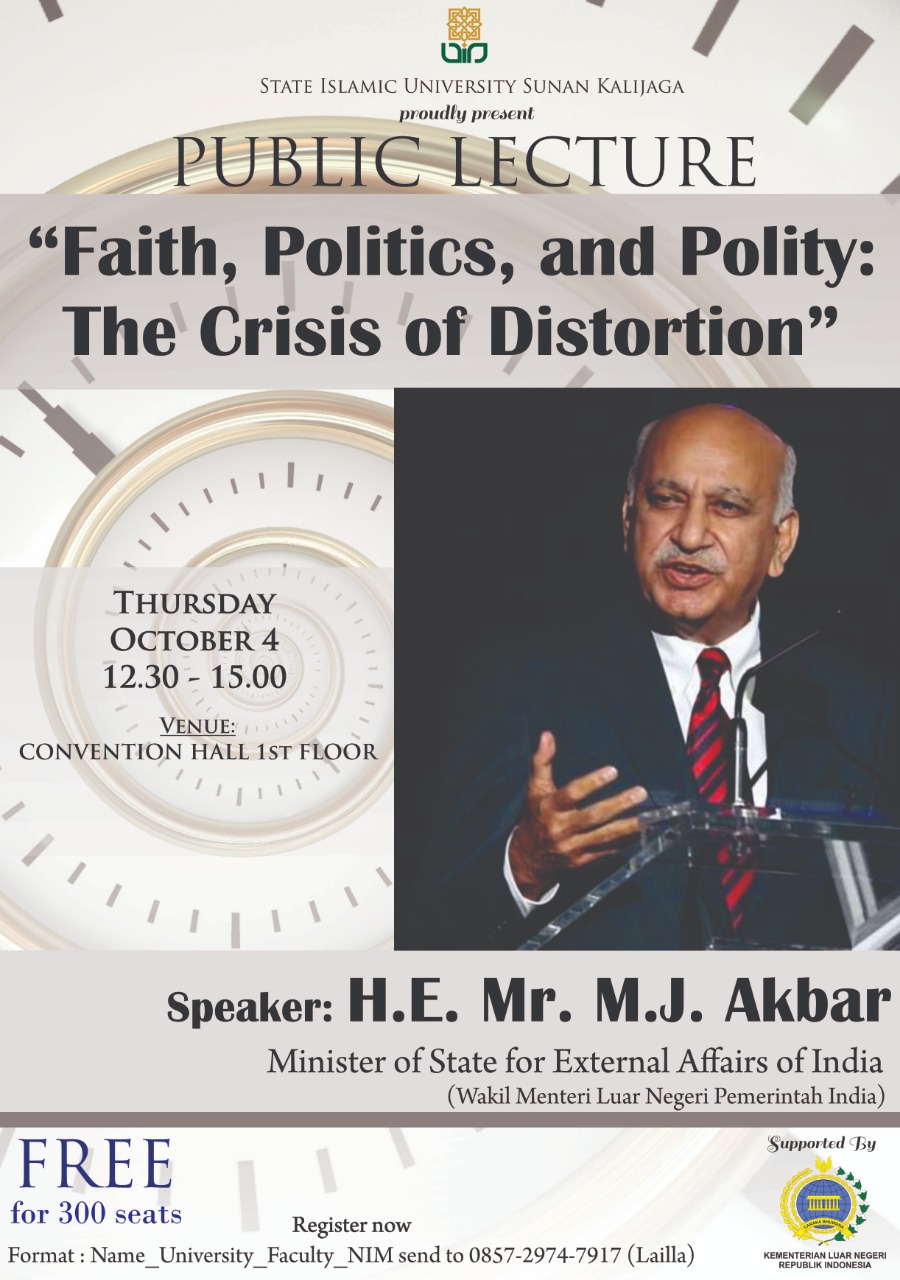 Public Lecture “Faith, Politics, and Policy : The Crisis of Distortion” Selasa, 2 Oktober 2018 09:56:14 WIB Dilihat : 1694 Kali Unduh