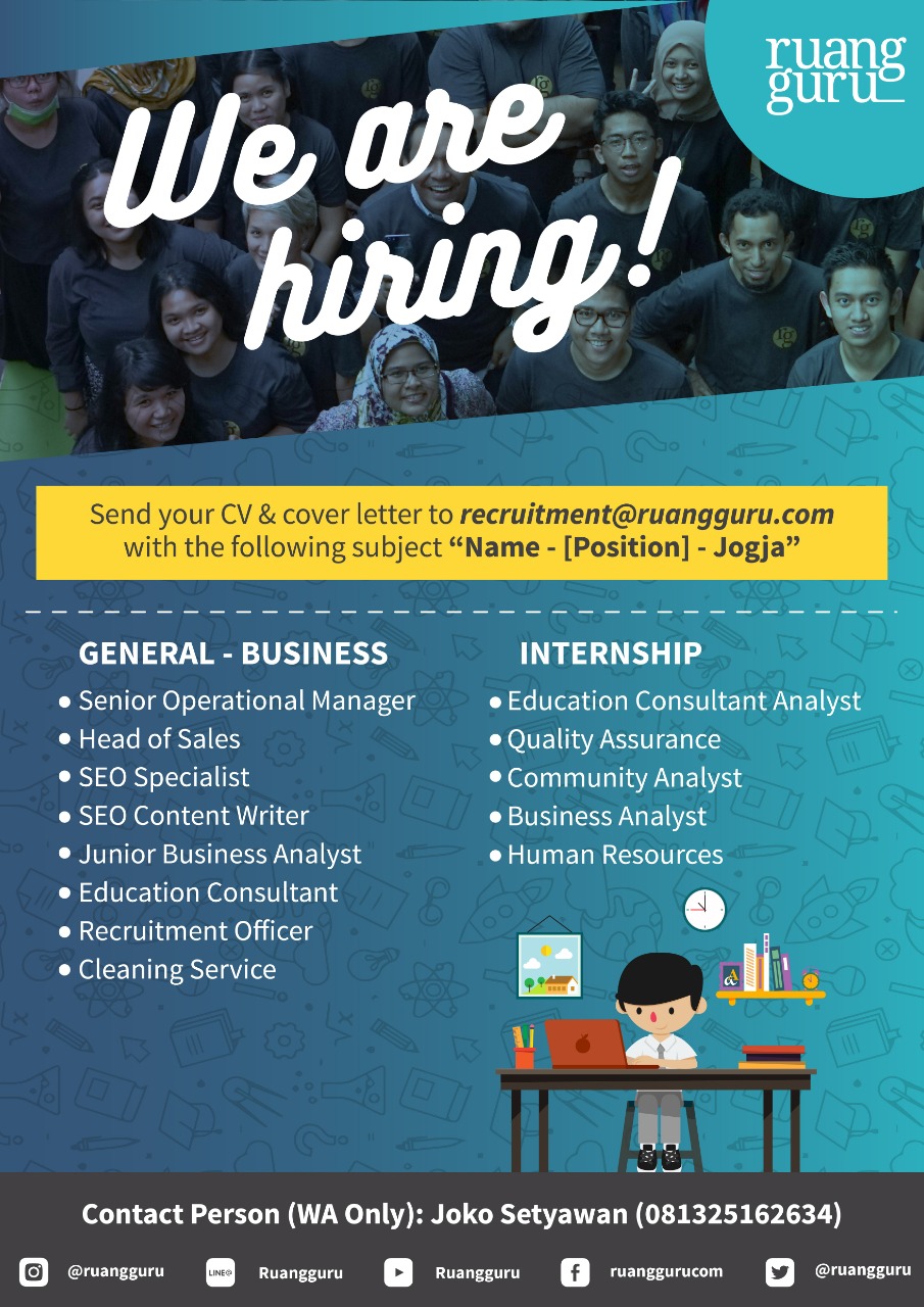 Loker Internship and General-Business: ruangguru Kamis, 1 November 2018 15:58:42 WIB Dilihat : 2845 Kali Unduh