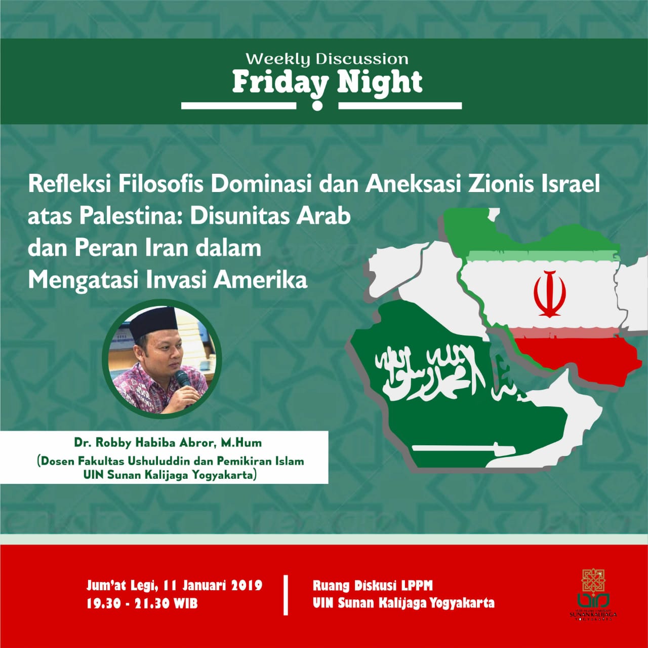 Diskusi Rutin Jumat Malam" Refleksi Filosofis Dominasi dan Aneksasi Zionis Israel atas Palestina" Kamis, 10 Januari 2019 13:24:43 WIB Dilihat : 1766 Kali Unduh