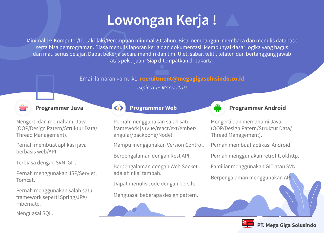Lowongan Kerja Programmer PT. Mega Giga Solusindo Kamis, 28 Februari 2019 08:17:04 WIB Dilihat : 2874 Kali Unduh
