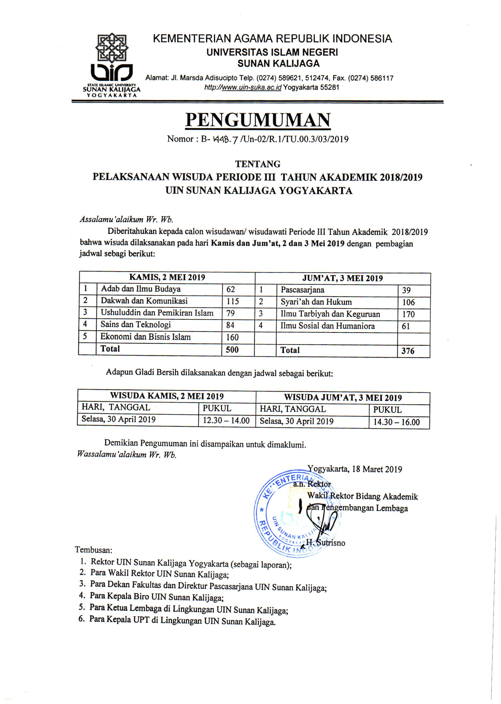 Pelaksanaan Wisuda Program S-1,S-2 Dan S-3 Periode III T.A. 2018-2019 Selasa, 26 Maret 2019 11:41:49 WIB Dilihat : 4488 Kali Unduh