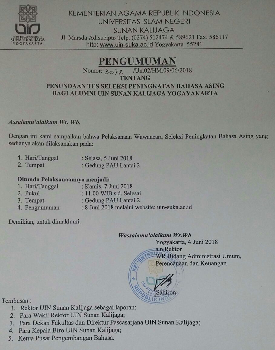 Penundaan Tes Seleksi Peningkatan Bahasa Asing Bagi Alumni UIN Sunan Kalijaga Yogyakarta Rabu, 6 Juni 2018 08:46:09 WIB Dilihat : 5859 Kali Unduh