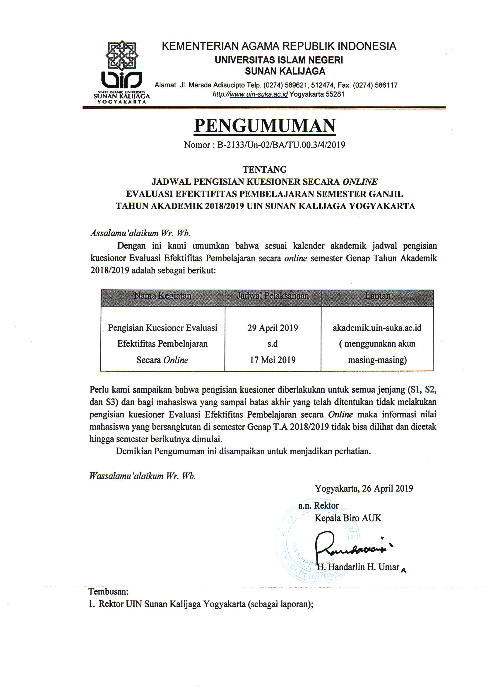 Jadwal Pengisian Kuesioner Online Evaluasi Efektifitas Pembelajaran Semester Ganjil T.A.2018/2019 Senin, 29 April 2019 16:18:14 WIB Dilihat : 4175 Kali Unduh