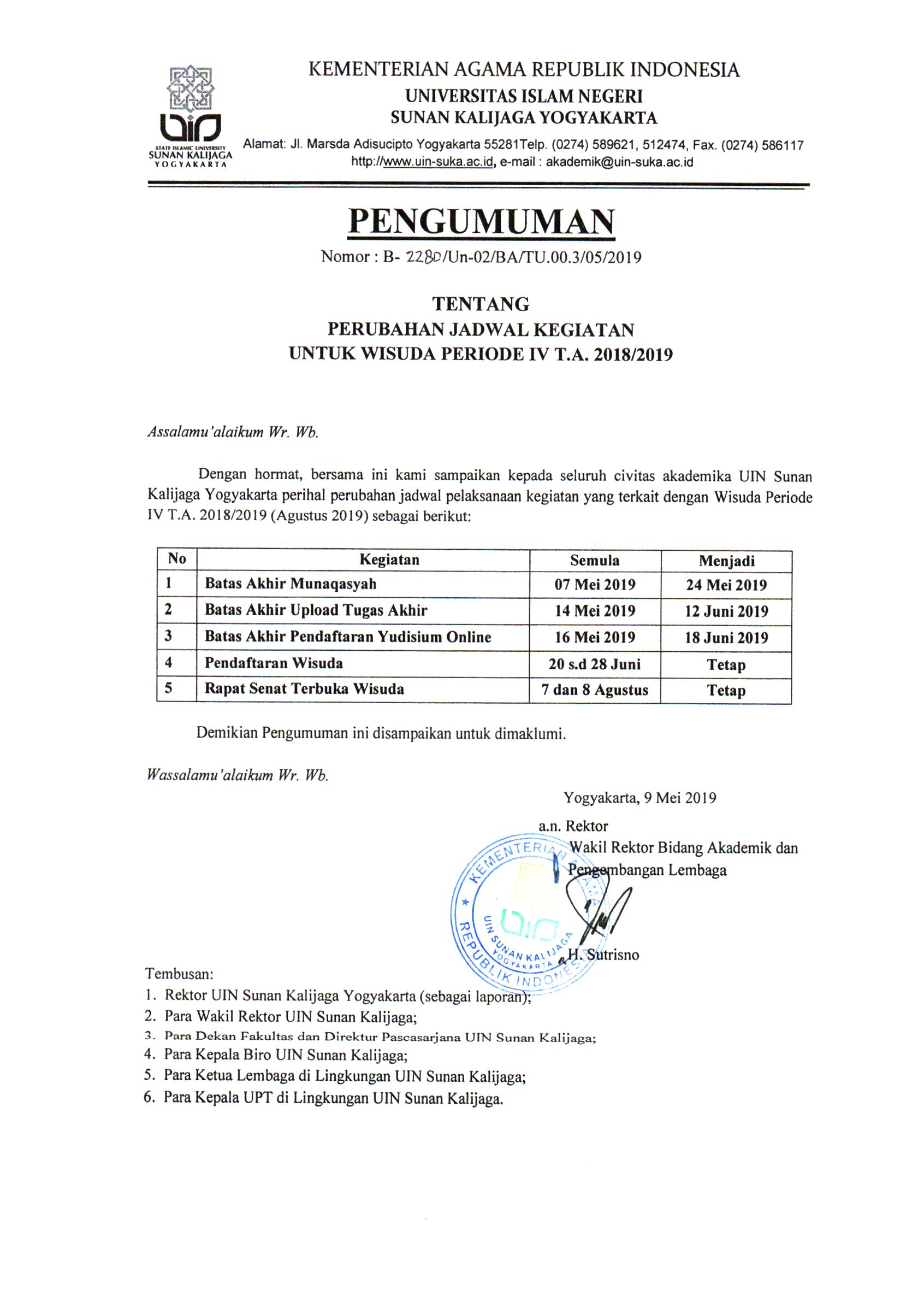 Perubahan Jadwal Kegiatan Untuk Wisuda Periode IV T.A. 2018/2019 Jumat, 10 Mei 2019 09:47:53 WIB Dilihat : 4741 Kali Unduh