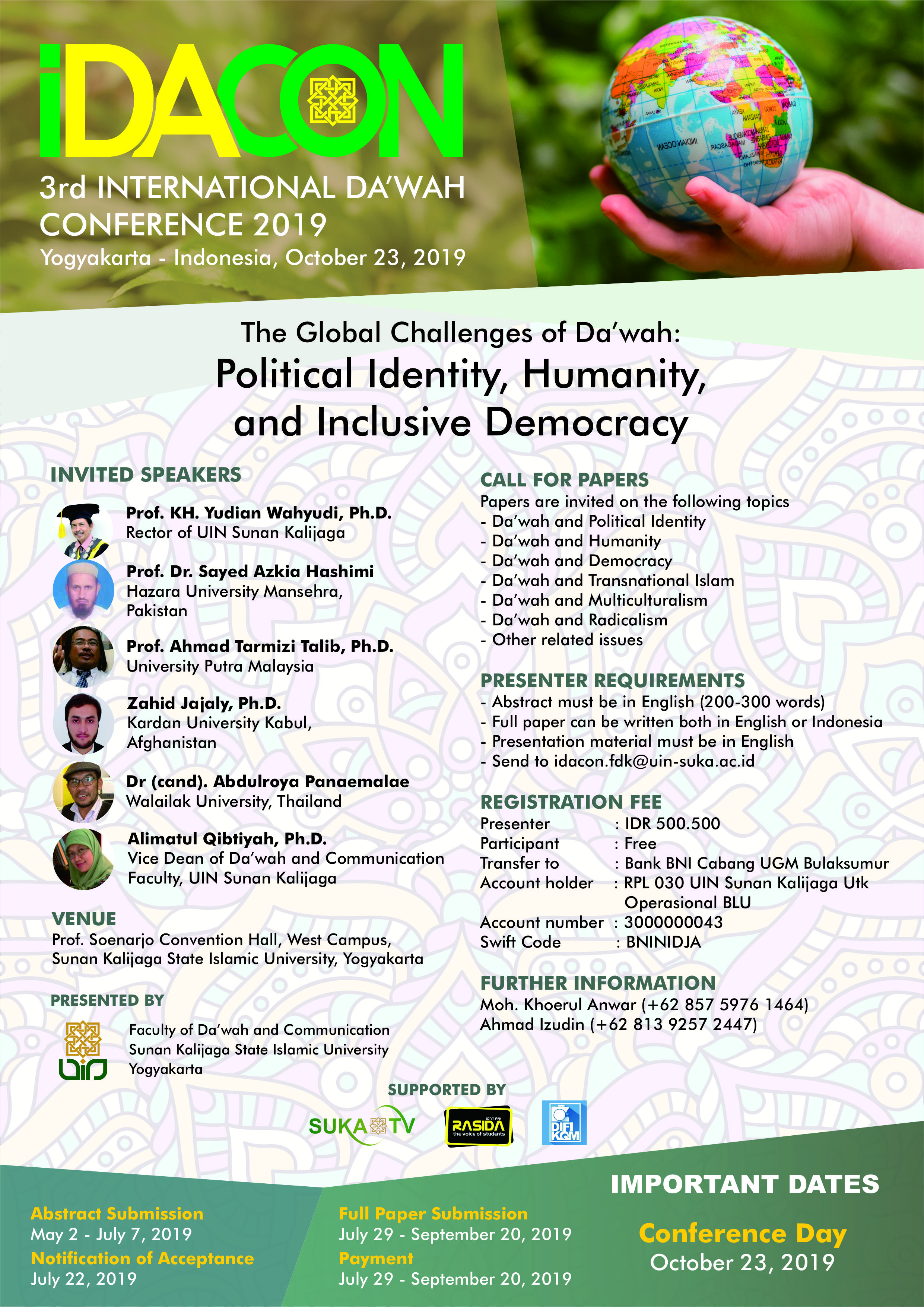 International Da'wah Conference (IDACON) 2019 "The Global Challenges of Da'wah:Political Identity, Humanity, and Inclusisive Democracy" Senin, 24 Juni 2019 12:16:42 WIB Dilihat : 3218 Kali Unduh