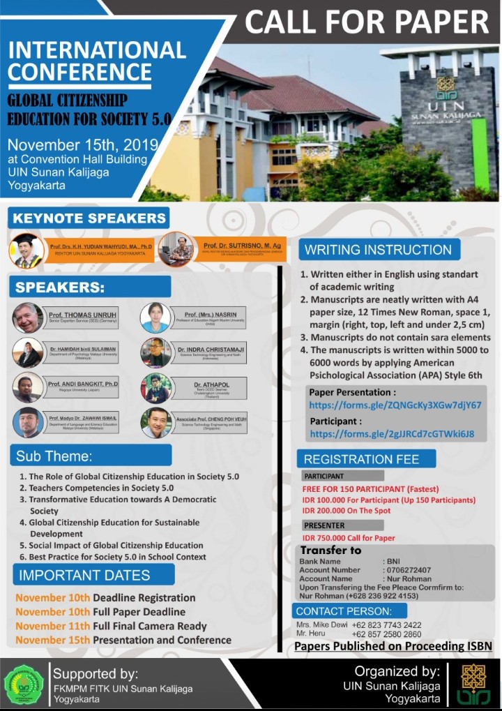 International Conference Global Citizenship Educatioan For Society 5.0 Kamis, 31 Oktober 2019 08:09:23 WIB Dilihat : 2667 Kali Unduh