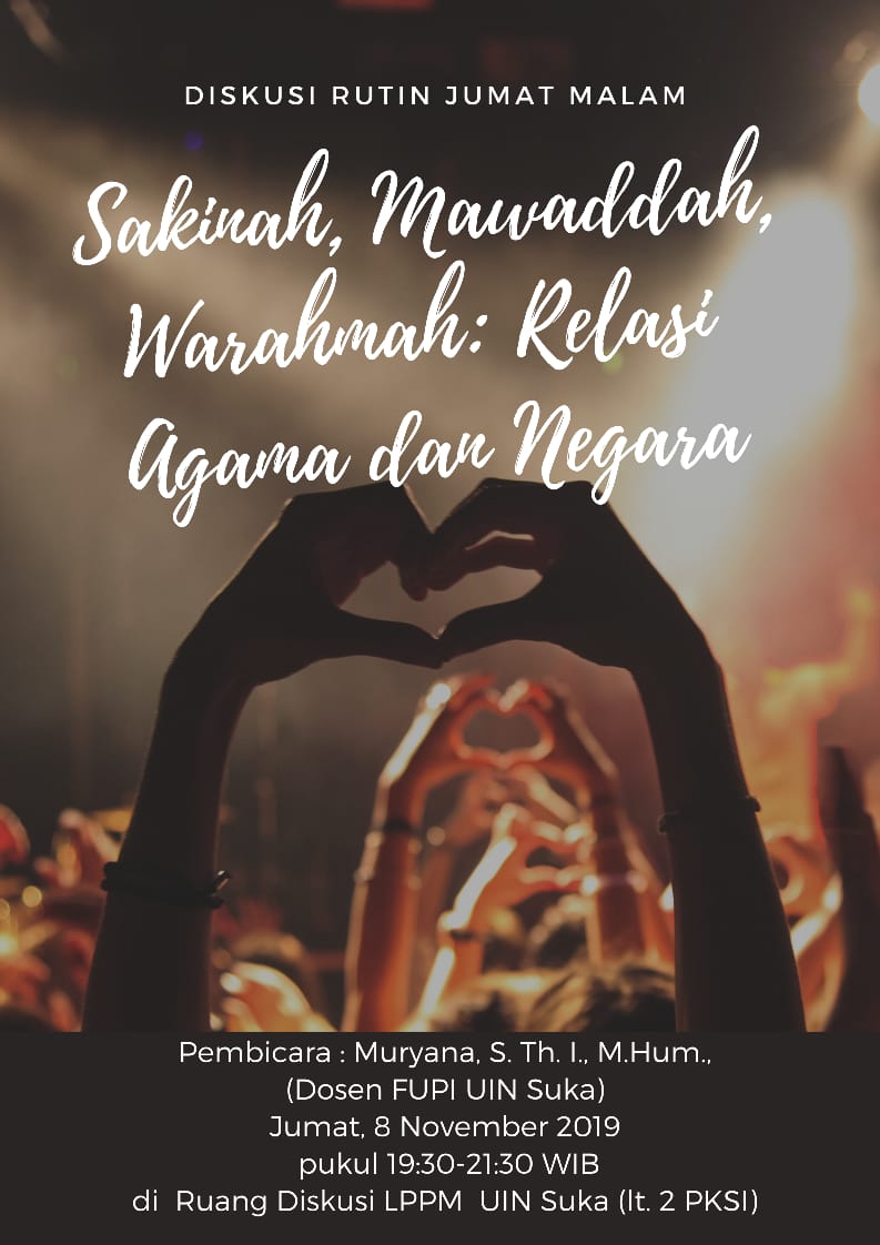 Diskusi Jumat Malam " Sakinah, Mawadah, Warahmah:Relasi Agama dan Negara" Jumat, 8 November 2019 14:21:37 WIB Dilihat : 2922 Kali Unduh