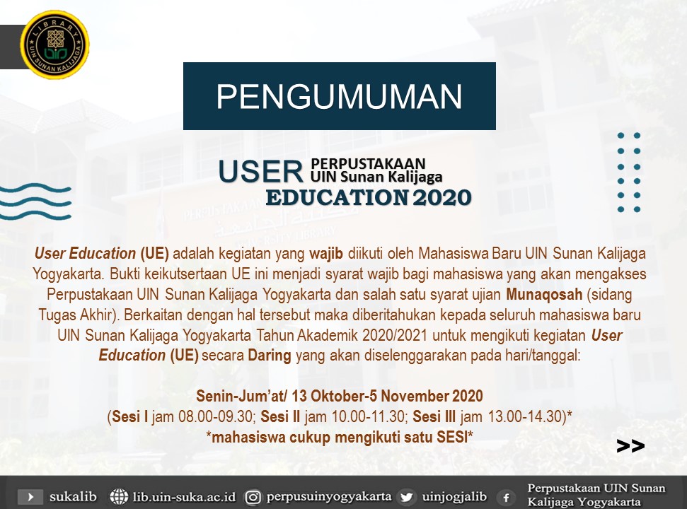 User Education 2020 UPT. Perpustakaan UIN SUKA Jumat, 9 Oktober 2020 12:07:34 WIB Dilihat : 2289 Kali Unduh Kunjungi Laman