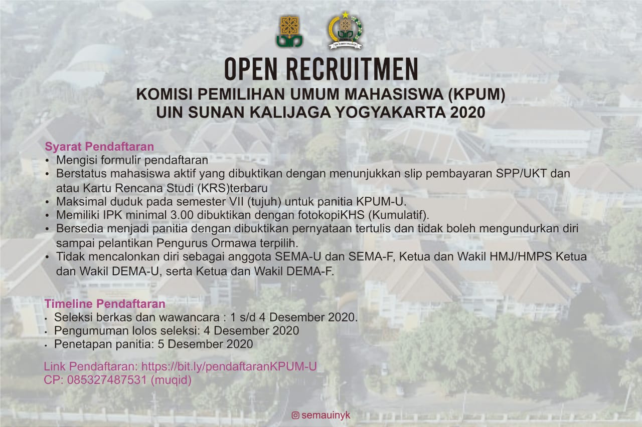 Open Recruitmen Komisi Pemilihan Umum Mahasiswa Selasa, 1 Desember 2020 10:00:26 WIB Dilihat : 2329 Kali Unduh