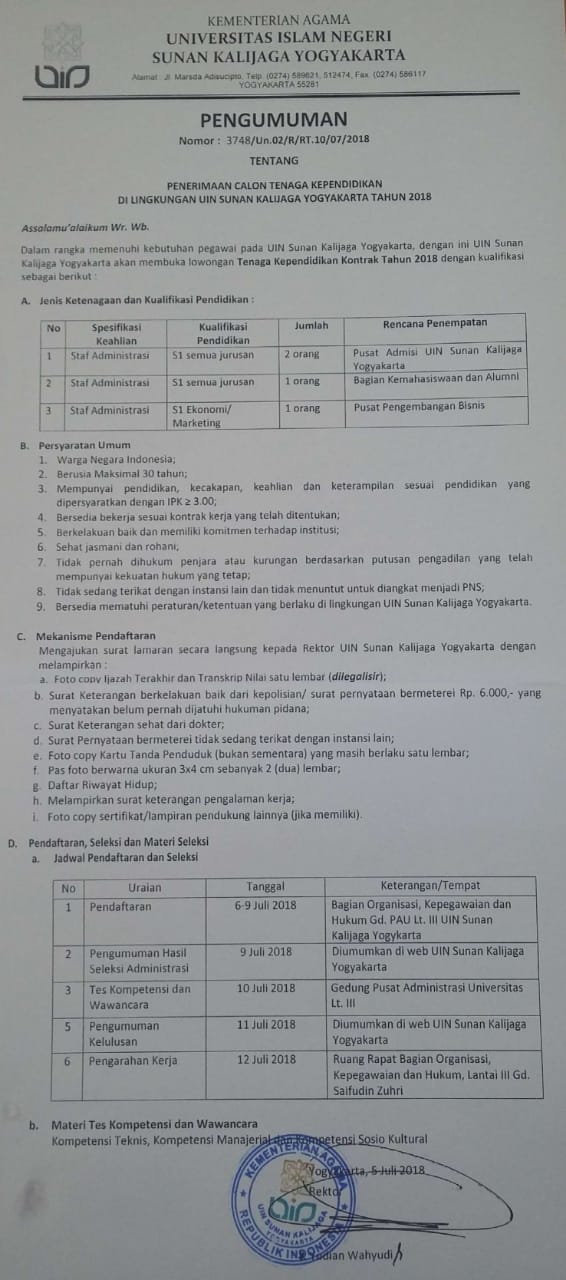 Penerimaan Calon Tenaga Kependidikan DI UIN Sunan Kalijaga Yogyakarta Jumat, 6 Juli 2018 09:44:58 WIB Dilihat : 14161 Kali Unduh