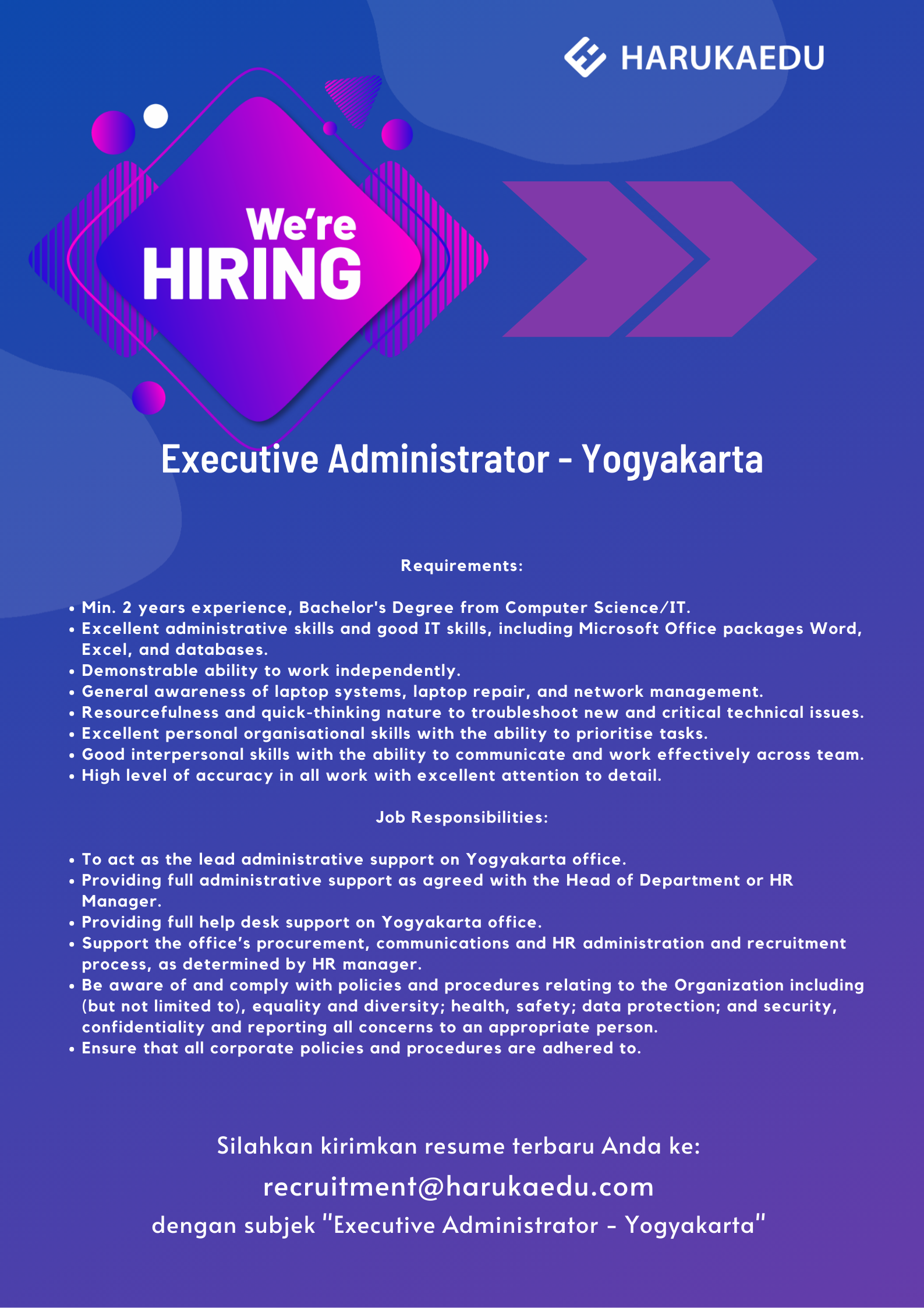 Lowongan Kerja Executive Administrator HarukaEdu Rabu, 28 April 2021 11:38:05 WIB Dilihat : 1730 Kali Unduh